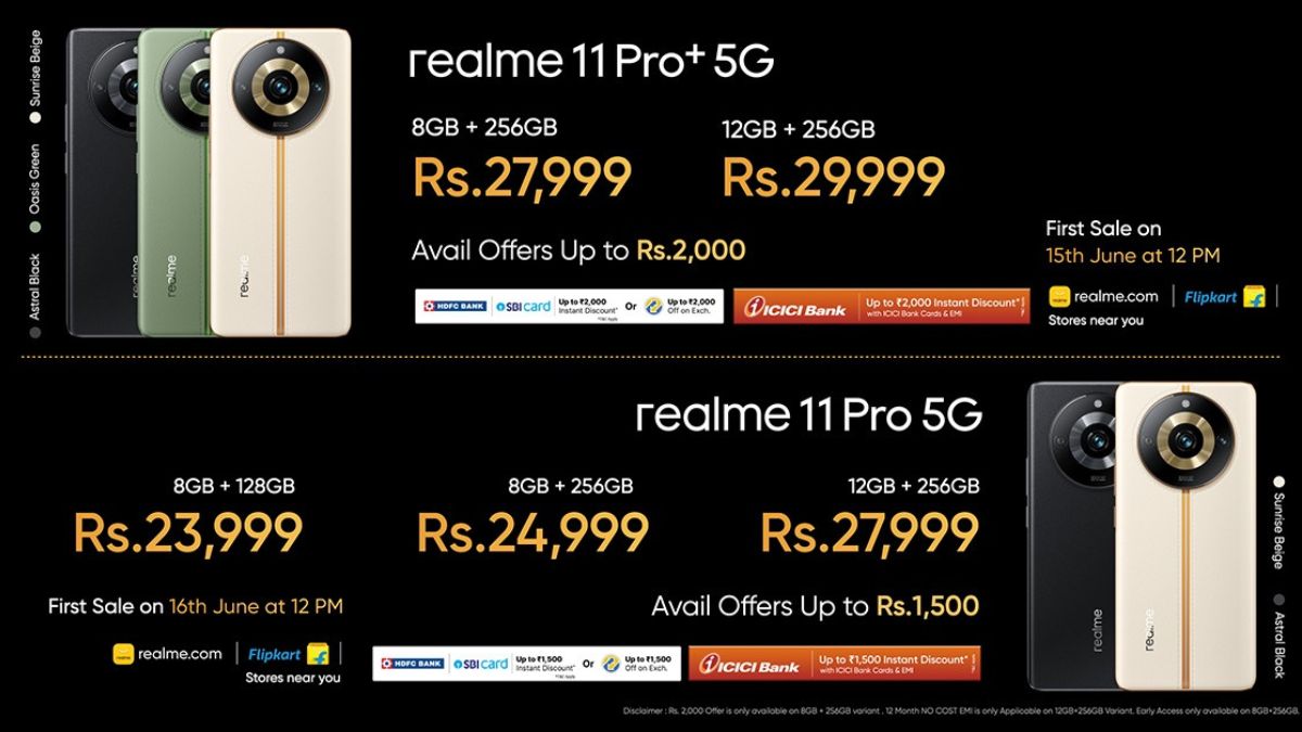 रियलमी 11 प्रो 5G के 8GB + 128GB वेरिएंट की कीमत 23,999 रुपये, 8GB + 256GB वेरिएंट की कीमत 24,999 रुपये और 12GB + 256GB वेरिएंट की कीमत 27,999 रुपये है। वहीं रियलमी 11 प्रो प्लस 5G के 8GB + 256GB की कीमत 27,999 रुपये और 12GB + 256GB वेरिएंट की कीमत 29,999 रुपये है।