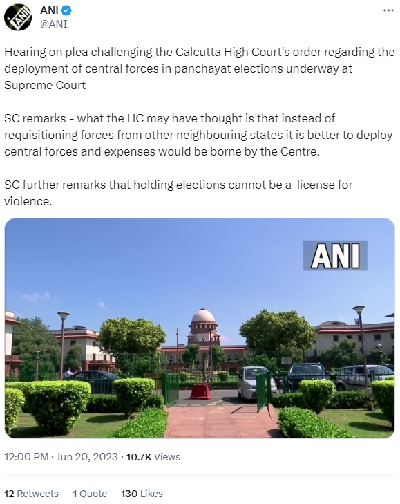 सुप्रीम कोर्ट ने कहा कि स्वतंत्र और निष्पक्ष चुनाव कराना राज्य चुनाव आयोग की जिम्मेदारी है। कोर्ट ने पूछा कि जहां से बल आते हैं वह राज्य चुनाव आयोग की चिंता नहीं है फिर याचिका कैसे विचारणीय है? मामले में एक प्रतिवादी की ओर से पेश वरिष्ठ अधिवक्ता हरीश साल्वे का कहना है कि राज्य में समस्या है। उन्होंने आरोप लगाया कि एजेंडा तैनाती की वास्तविक चिंता नहीं है, लेकिन एजेंडा यह है कि केंद्रीय बलों को मत बुलाओ।