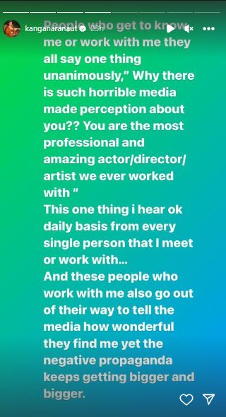 कंगना का गुस्सा यही पर शांत नहीं हुआ। उन्होंने मीडिया पर निशाना साधते हुए कहा, "जिन लोगों ने मेरे साथ काम किया है, वह हमेशा यही कहते हैं कि मीडिया ने आपके लिए इतनी भयानक धारणा क्यों बनाई हुई है। मुझे हमेशा कहा है कि मैं प्रोफेशनल एक्टर डायरेक्टर और आर्टिस्ट हूं, जिनके साथ उन्होंने काम किया है। ये बात मैं आए दिन अपने लिए सुनती हूं।