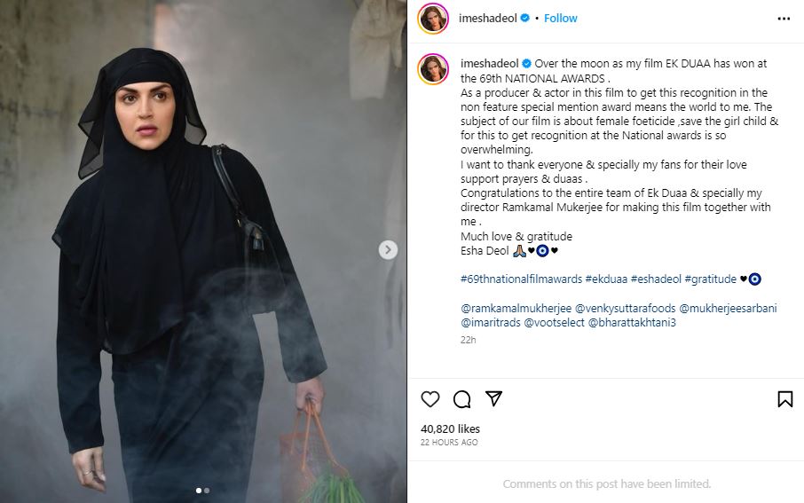 अपनी इस पोस्ट के कैप्शन में एशा देओल ने आगे लिखा, "मैं हर किसी को धन्यवाद देना चाहती हूं। खासकर अपने फैंस को, जिनका प्यार-सपोर्ट और दुआ मेरी फिल्म के साथ रही है। 'एक दुआ' की पूरी टीम को बहुत-बहुत शुभकामनाएं।